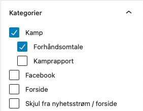 Du finner kategorivelgeren i høyre kolonne i WP admin. Etter at du har valgt kategori, lagre artikkelen og last inn adminsiden på nytt.