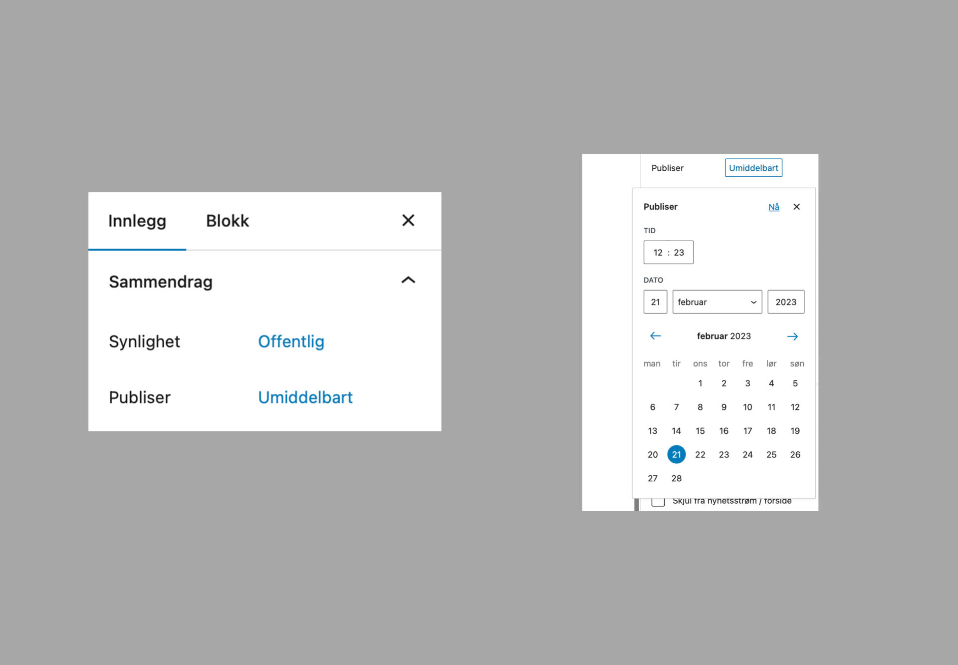 I sidefeltet, under fanen Innlegg finner du innstillinger for publisering:
