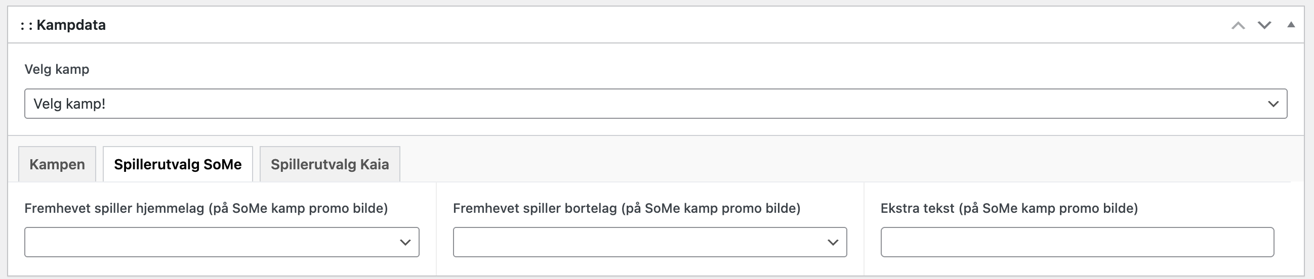 Under fanen Spillerutvalg SoMe kan du velge spiller til hjemme- og bortelag, og legge inn tekst, på samme måte som tidligere.