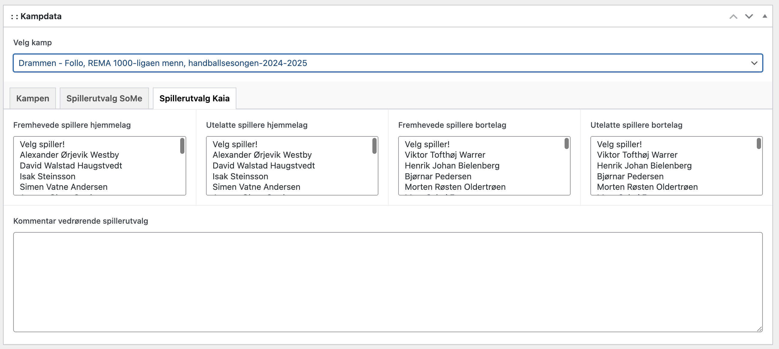 Under fanen Spillerutvalg Kaia kan du påvirke hvilke spillere Kaia skal eller ikke skal skrive om i forhåndsomtale og kamprapport.