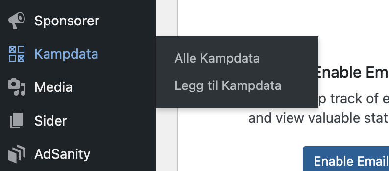 Istedet for å legge til en ny rad for hver kamp – noe som over tid ville kunne gjøre kampsiden veldig tung å jobbe med – kan dere nå rett og slett opprette et nytt innlegg av typen kamp direkte fra sidemenyen i WordPress: