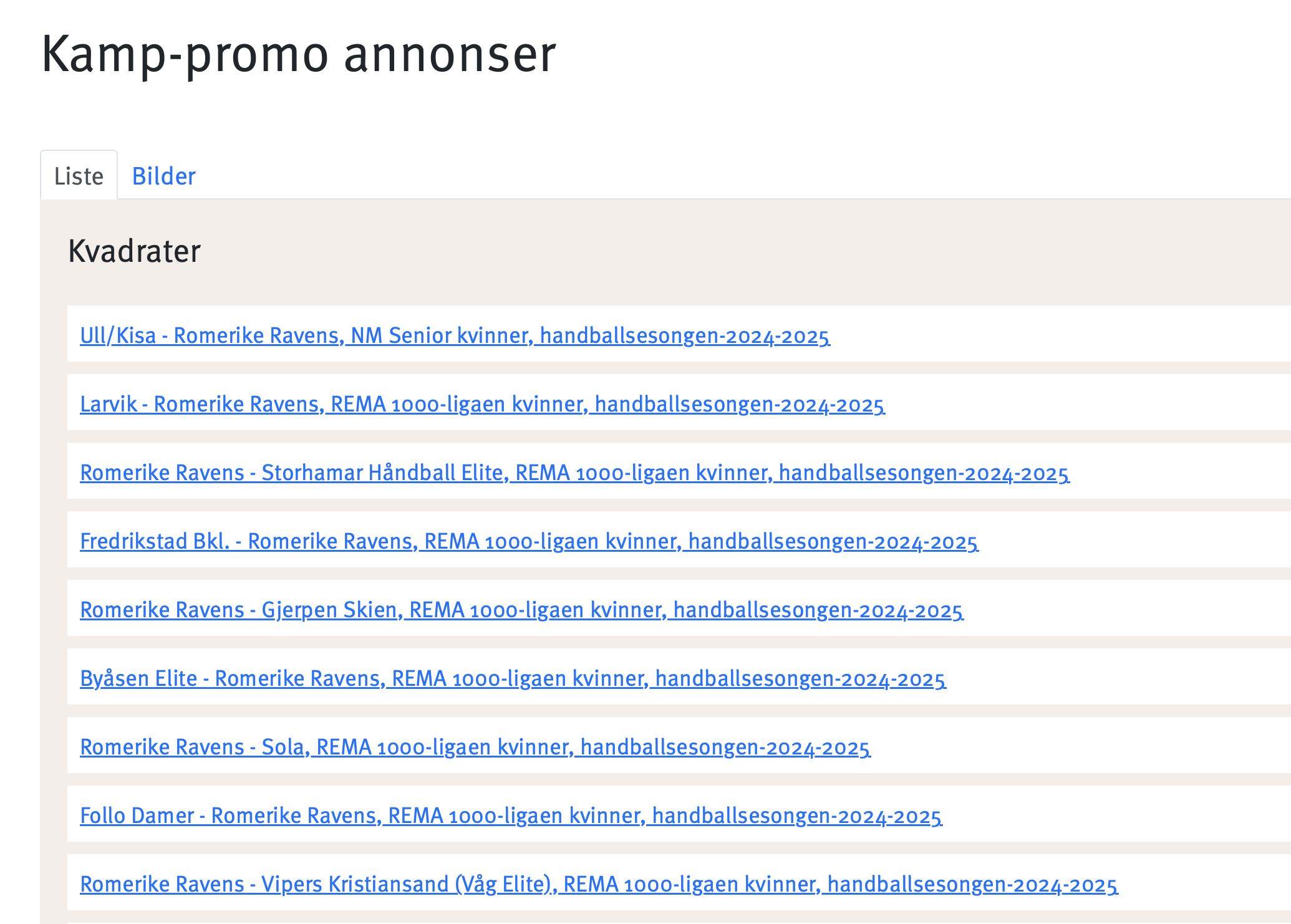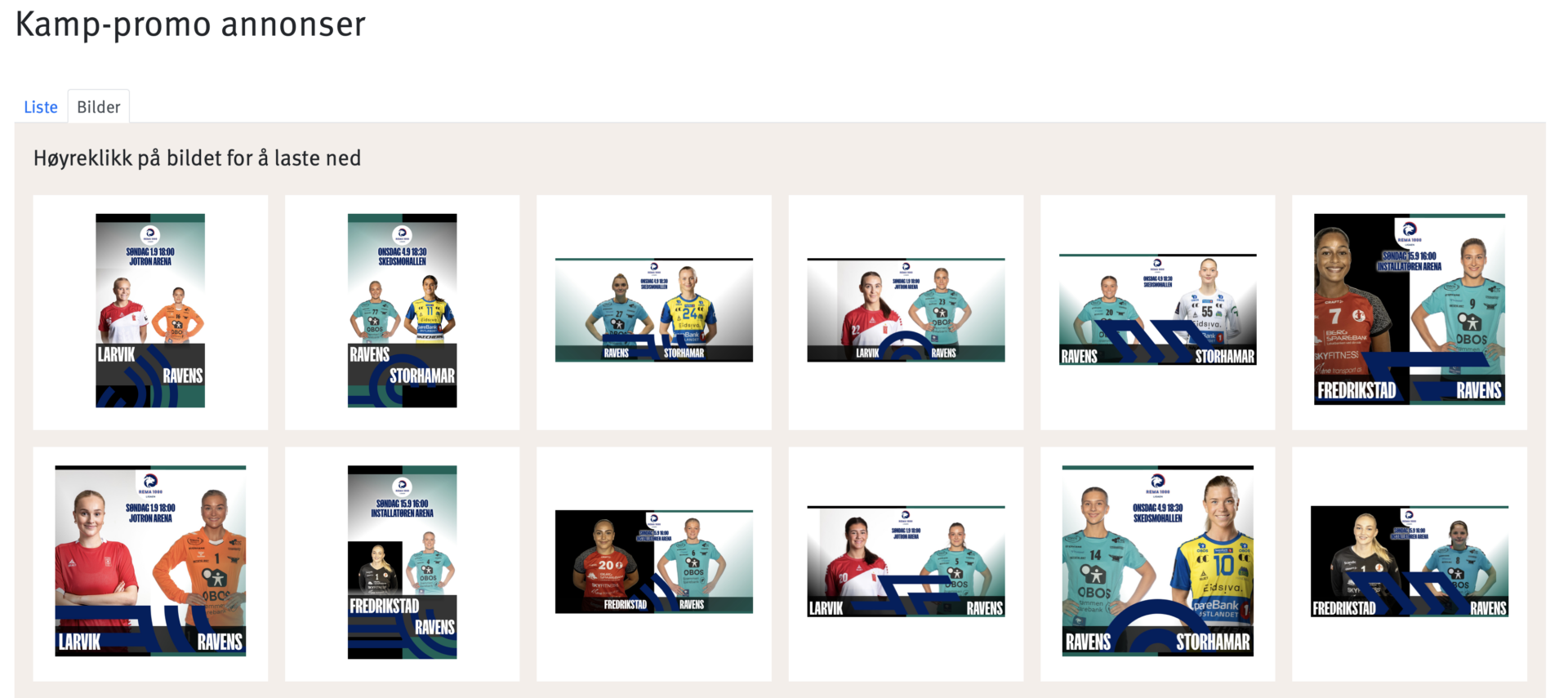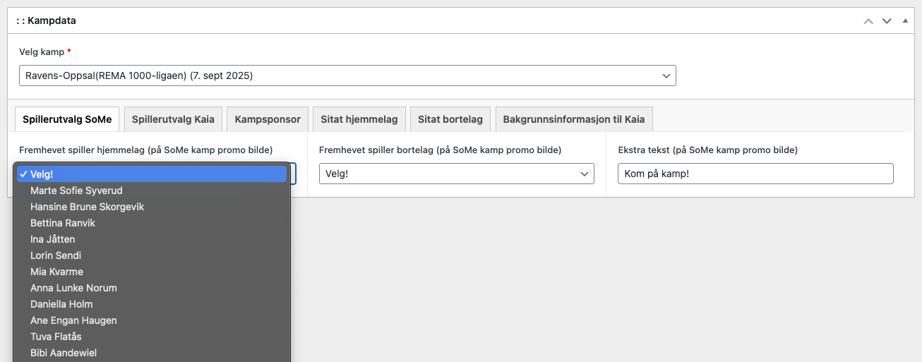 Du kan forøvrig foregripe den automatiske genereringen ved å gå inn på menypunktet «For admin: SoMe kamp-promotering». Her kan du velge kampen du vil lage bilder til i listen – og ta skjermbilde av det ferdige resultatet og legge ut i dine kanaler.