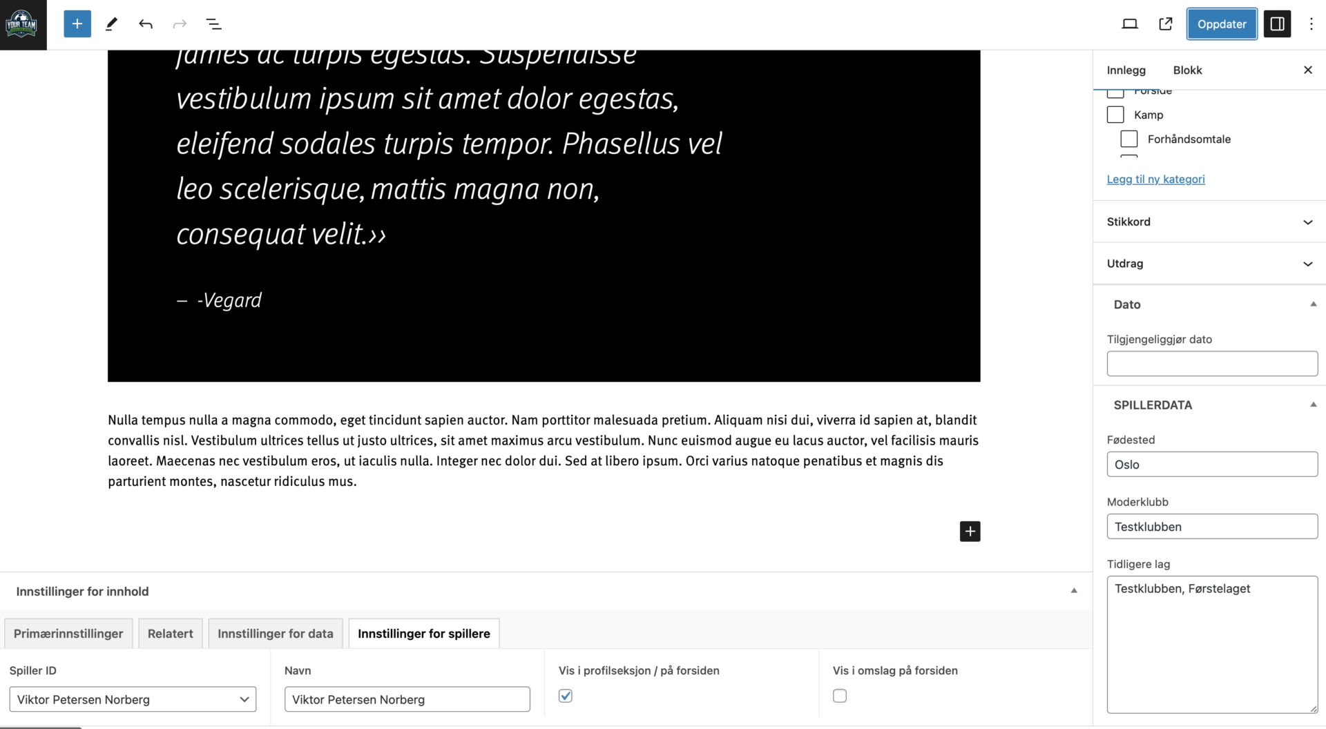Dette innebærer at alle spillere i stallen din får en visning med bl.a. bilde og statistikk. Dersom du ønsker det kan du i tillegg lage presentasjon av spillerne dine ved å lage innlegg som du merker med spilleren, og legger i kategorien Spillere. Her kan man også legge inn fødested og tidligere klubber.